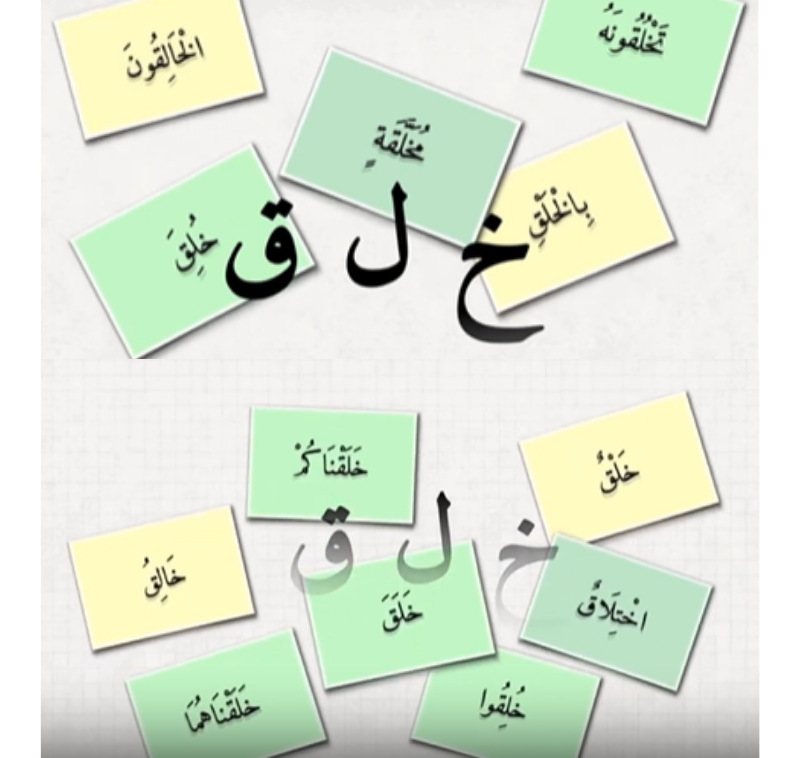 Lots of Arabic words can be originated from kha-lam-Qaf. This 3-lettered word is root and acts as the skeleton of the word. Different patterns are added to this “root” to form a variety of words.